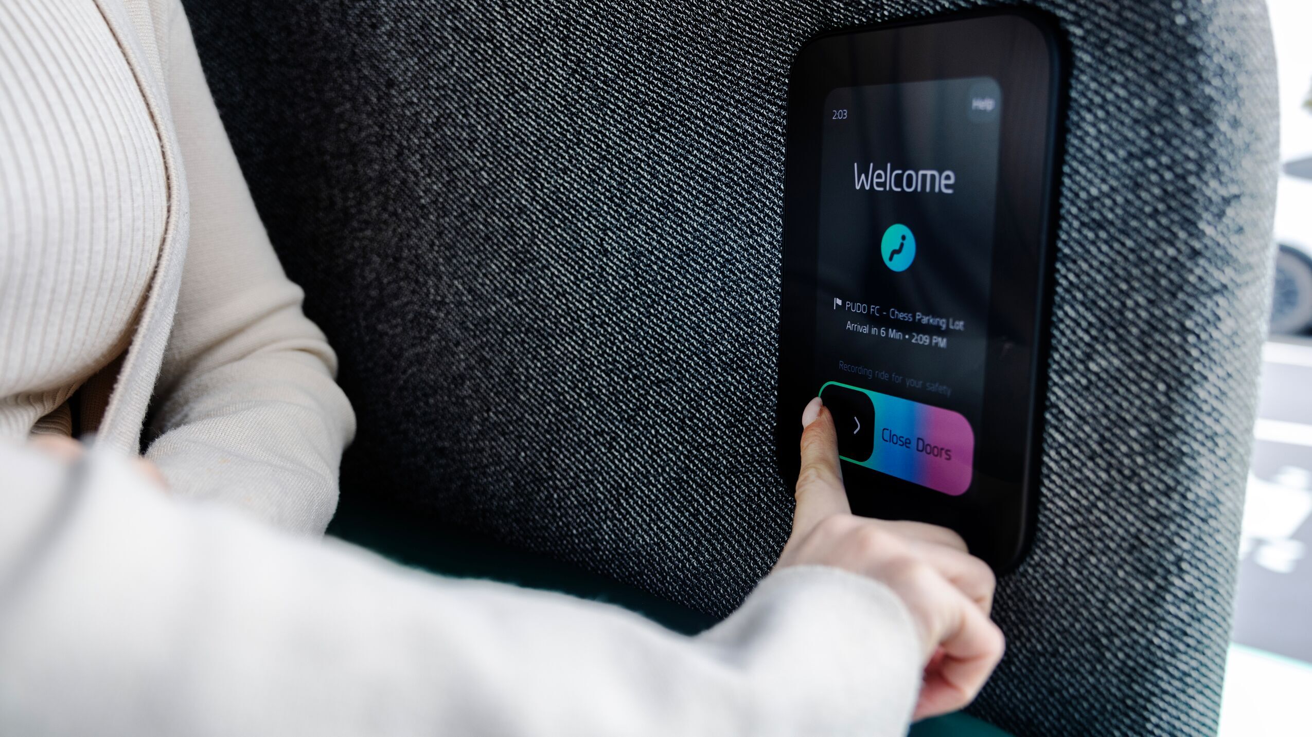 The screen on the inside prompts you to close the door and start your ride. Once you give it the go-ahead, you’re off to your next location. I did the honors to kick off our ride.